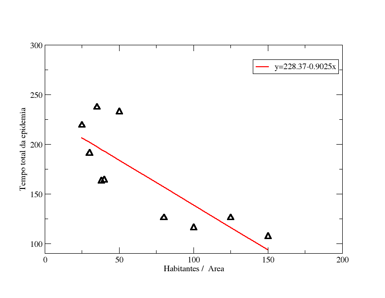 O gráfico acima relaciona a densidade populacional com o tempo total da epidemia. A curva em vermelho representa o ajuste linear dos pontos. Na minha opinião, este é o primeiro resultado contra intuitivo. A medida que a densidade populacional aumento a diminui o tempo total da epidemia.