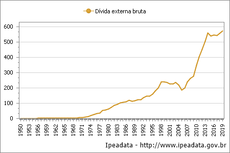 O gráfico abaixo mostra a evolução da divida externar brasileira em bilhões de dólares.
