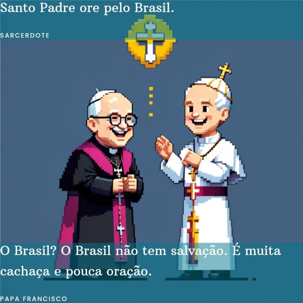Para ilustrar esse ponto, vamos ver duas imagens que criei. A primeira é uma citação do Papa Francisco. A segunda é uma conversa entre um sacerdote e o Papa Francisco, que faz uma brincadeira sobre o Brasil.