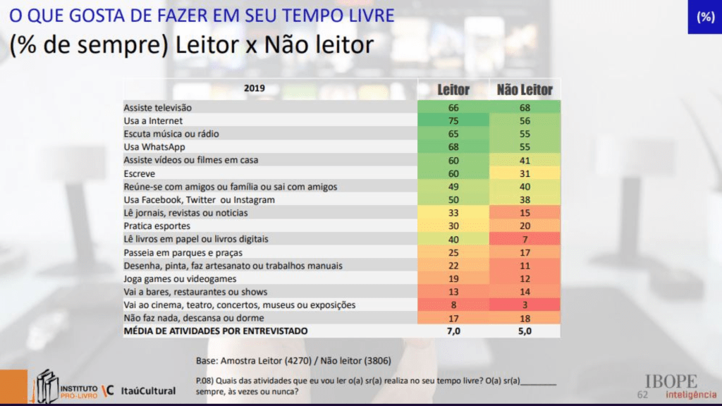 O estudo classifica como leitor todas as pessoas que leram um livro completo ou em partes nos últimos 3 meses. Observe que a variabilidade de atividades e o tempo gasto nelas é em geral maior no grupo de leitores do que nos não leitores.