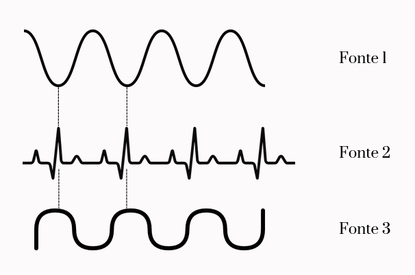 Se você pudesse “ver” o som, perceberia que o formato das ondas muda de instrumento para instrumento. Uma flauta gera ondas quase suaves, próximas de uma senóide. Já um violino tem ondas cheias de pequenas irregularidades, resultado da vibração das cordas e da madeira. Essas diferenças fazem com que, mesmo tendo o mesmo período (T) — e portanto a mesma frequência (f = 1/T) — os sons carreguem características únicas.